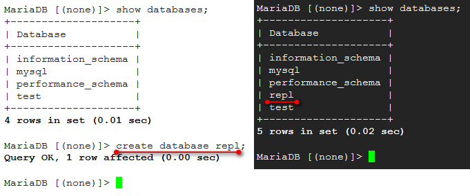 6)测试互相复制:节点128创建数据库repl,129节点复制,也有了repl库