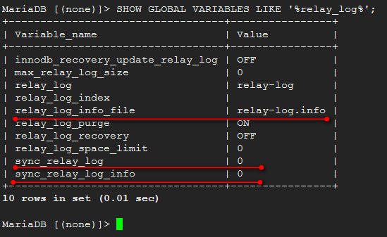 sync_relay_log_info:当设置为 1 时,slave 的 I/O 线程每次接收到 master 发送过来的 Binlog 日志都要写入系统缓冲区,然后刷入 relay-log.info 里,这样是最安全的,因为在崩溃的时候,你最多会丢失一个事务,但会造成磁盘的大量 I/O。当设置为 0 时,并不是马上就刷入 relay-log.info 里,而是由操作系统决定何时来写入,虽然安全性降低了,但减少了大量的磁盘 I/O 操作。这个值默认是0,可动态修改,建议采用默认值。