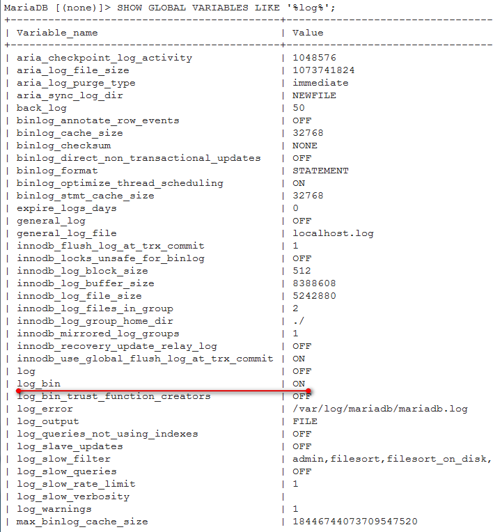 查看日志状态:SHOW GLOBAL VARIABLES LIKE '%log%';
