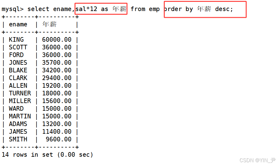 select ename,sal*12 as 年薪 from emp order by 年薪 desc;
