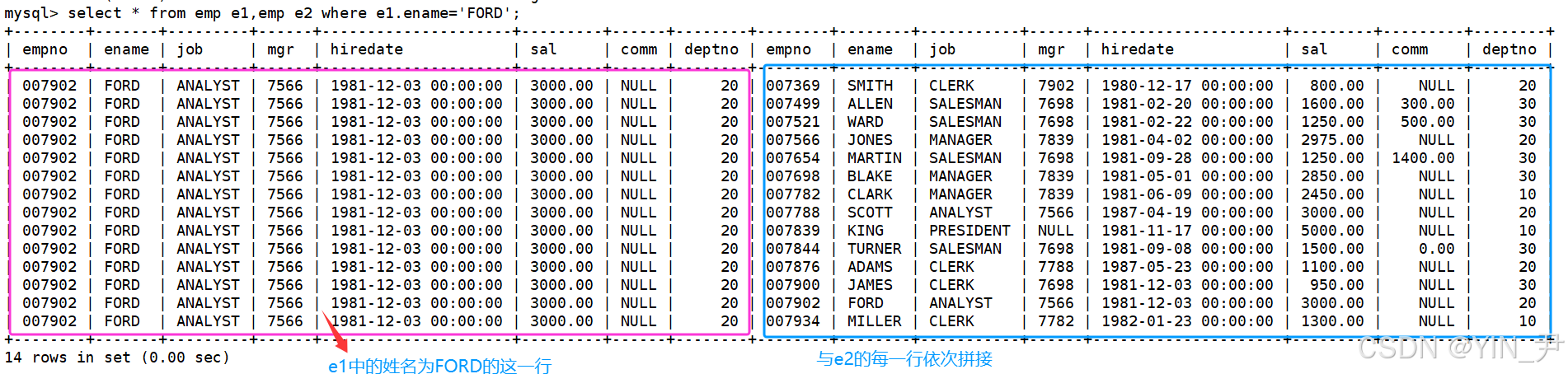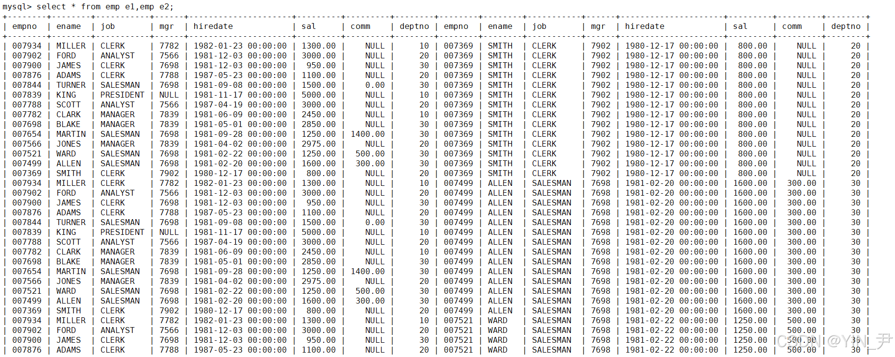 可以先看一下对emp进行自连接(自笛卡尔积)的结果