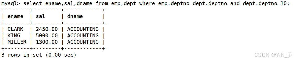 select ename,sal,dname from emp,dept where emp.deptno=dept.deptno and dept.deptno=10;