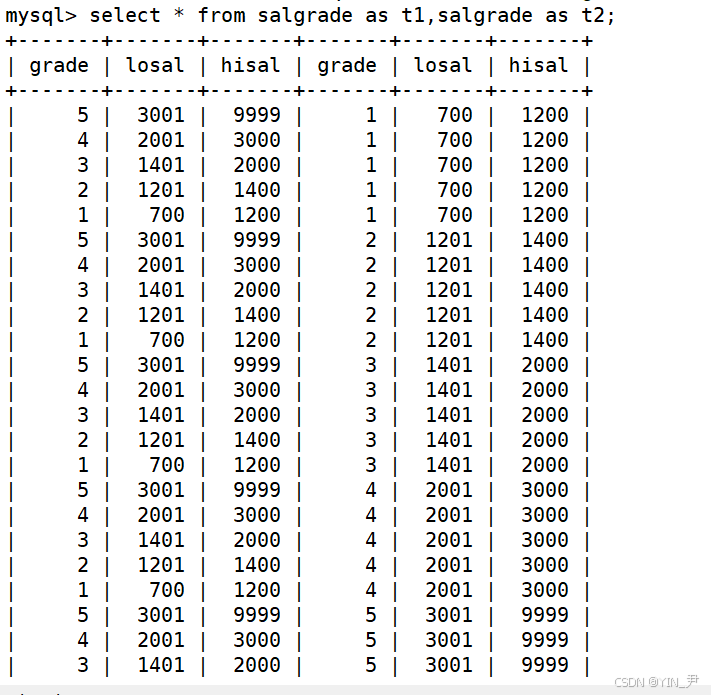 select * from salgrade as t1,salgrade as t2;
