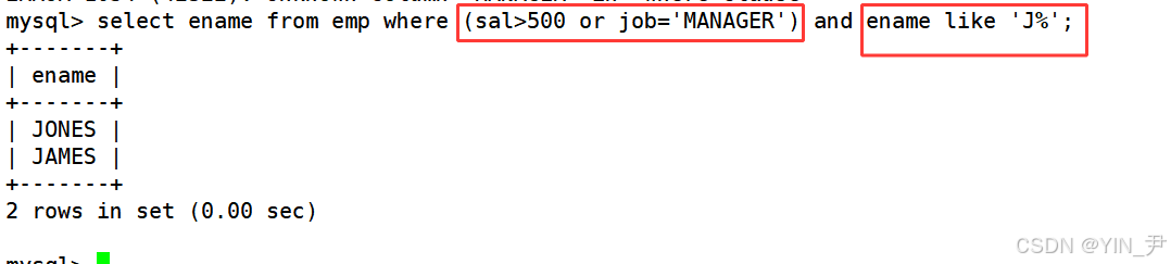 1.1 查询工资高于500或岗位为MANAGER的雇员,同时还要满足他们的姓名首字母为大写的J