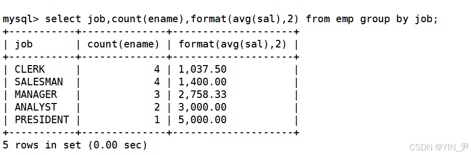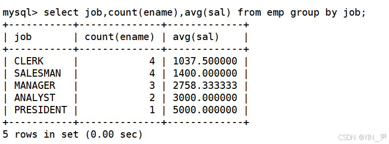 select job,count(ename),avg(sal) from emp group by job;
