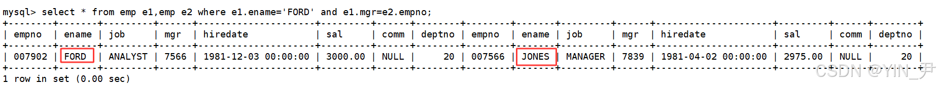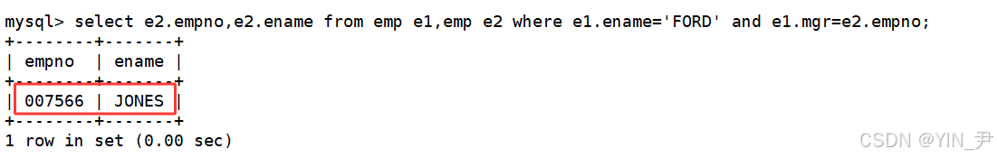 然后此时,e1的这一行中的mgr就是FORD的领导编号,他的领导肯定不是自己,那么这个编号对应的人就要在e2中查找。