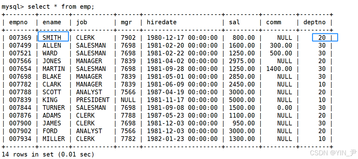 emp表中,我们看到他的部门编号是20