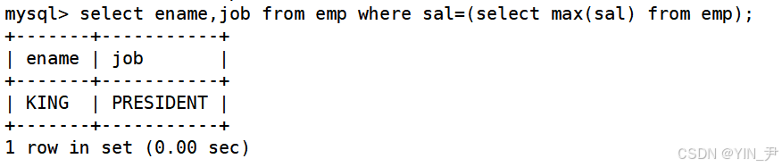 select ename,job from emp where sal=max(sal);
