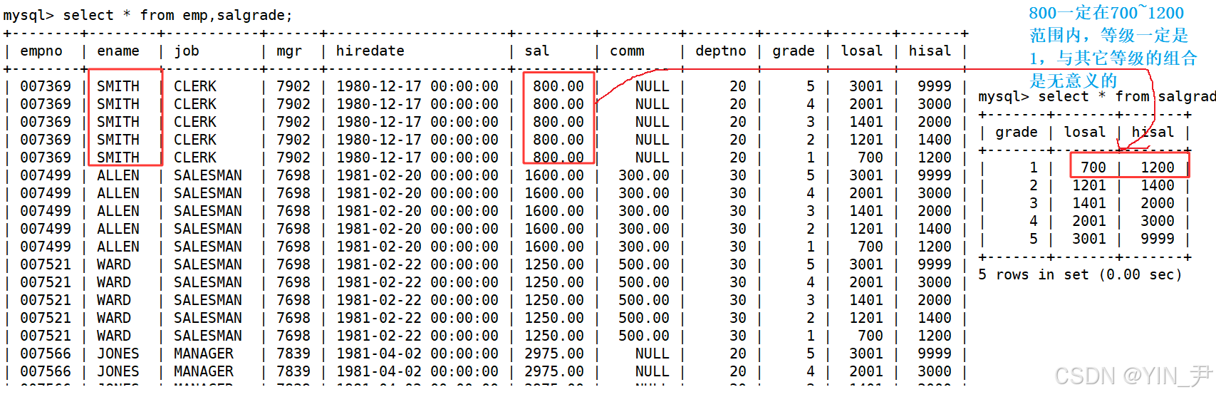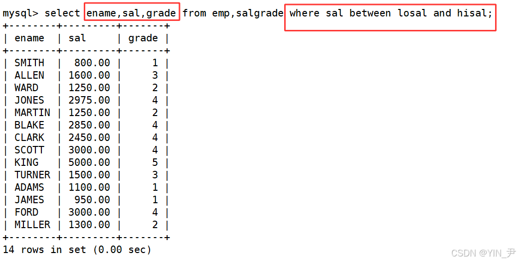 在salgrade里面呢,所以这次就应该查询emp和salgrade这两张表,从他们的笛卡尔积中查找。