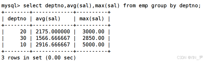 select deptno,avg(sal),max(sal) from emp group by deptno;
