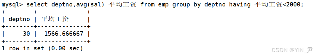 select deptno,avg(sal) 平均工资 from emp group by deptno having 平均工资<2000;