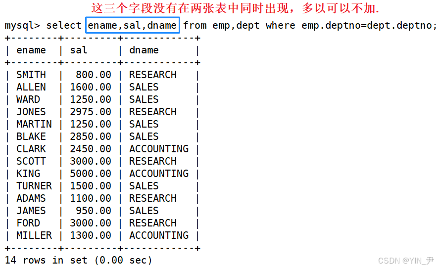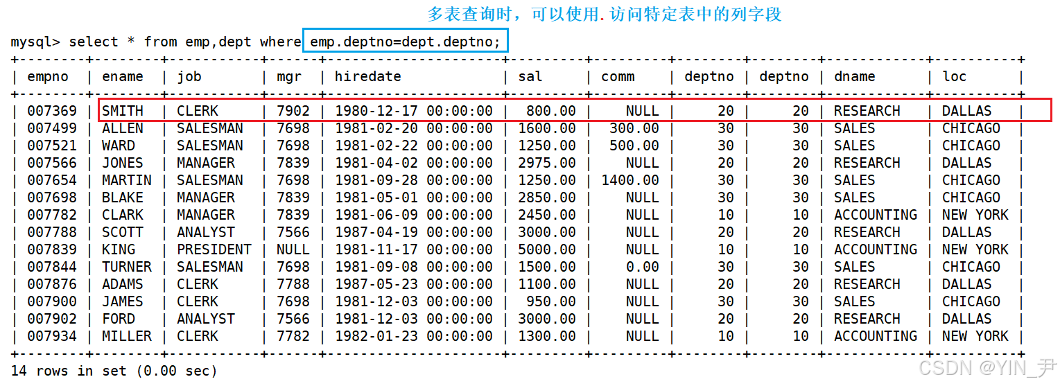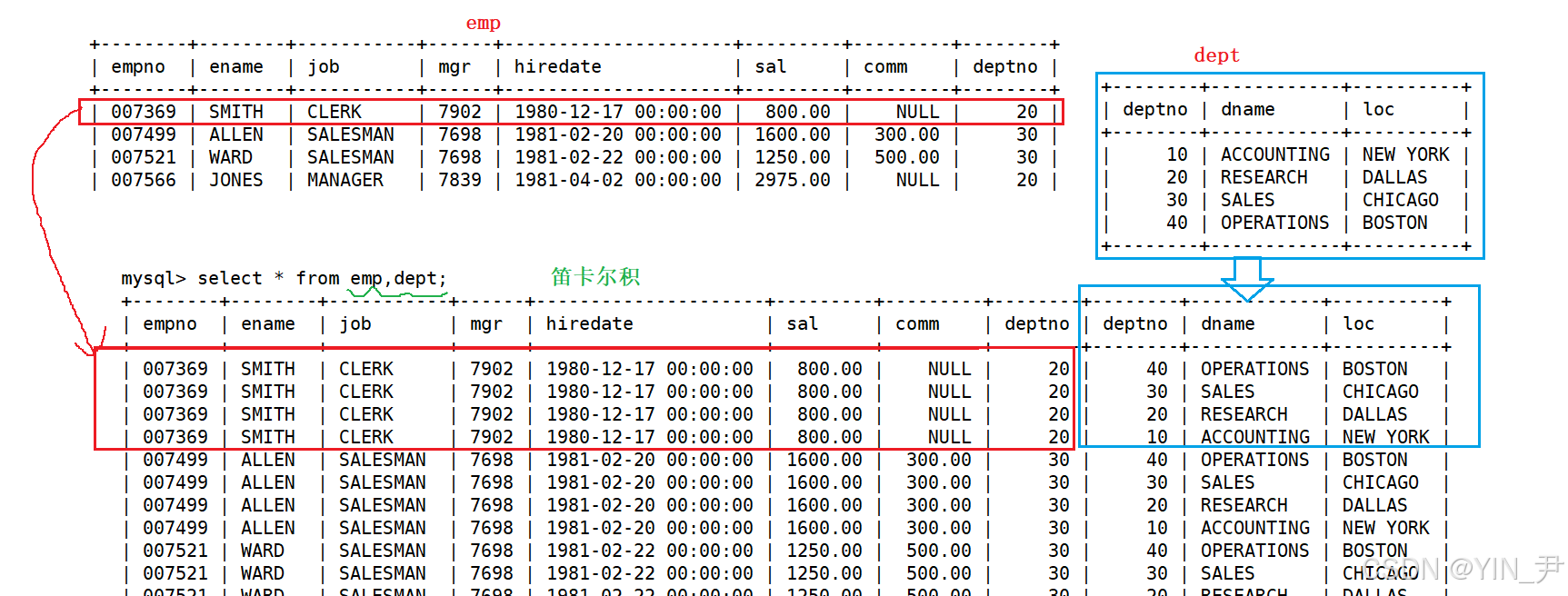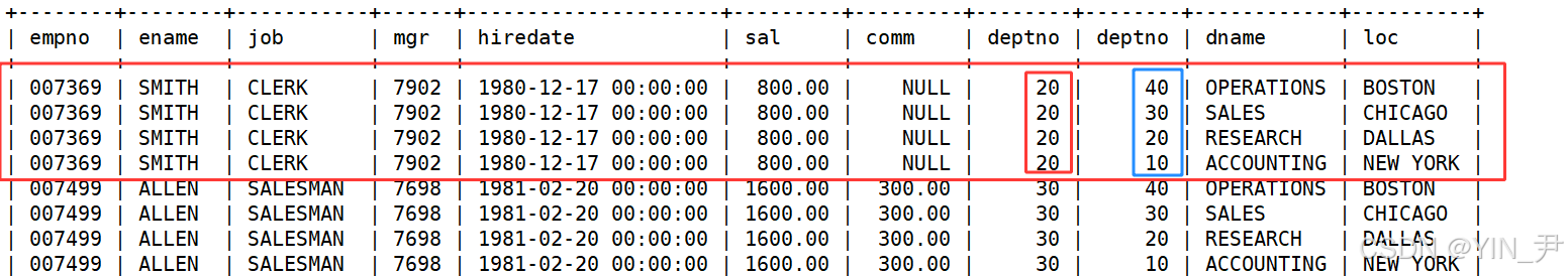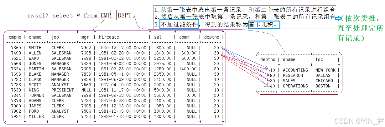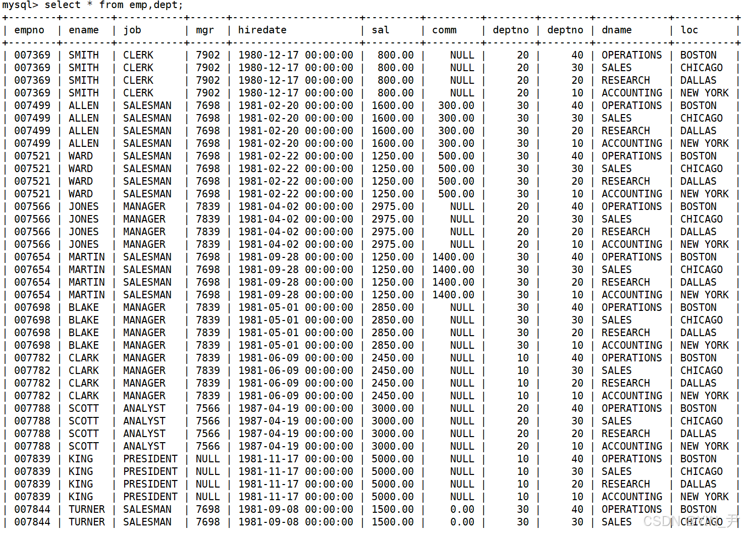 其实得到的这张表就是emp和dept的笛卡尔积(当然也可以是更多张的表)。(等价写法:SELECT * FROM emp CROSS JOIN dept;)