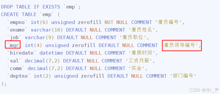 `mgr` int(4) unsigned zerofill DEFAULT NULL COMMENT '雇员领导编号',