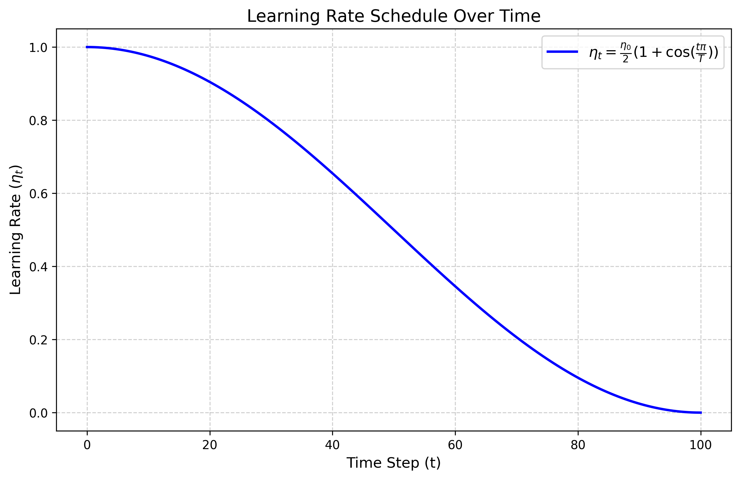 η t = η 0 2 ( 1 + cos ( t π T ) ) \eta_t = \frac{\eta_0}{2}(1 + \cos(\frac{t\pi}{T})) ηt=2η0(1+cos(Ttπ))