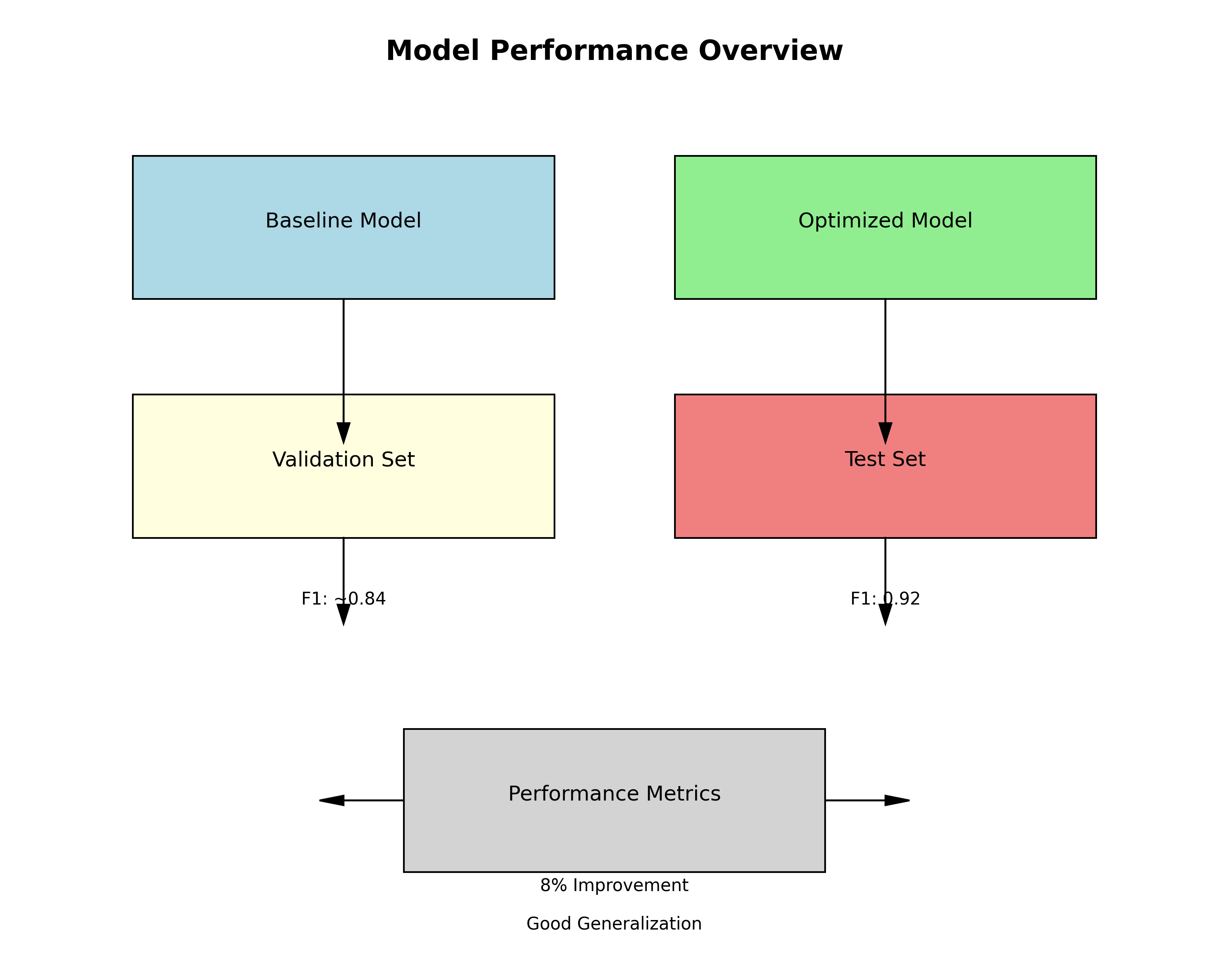 通过上述训练策略的优化,我们的模型在验证集上的F1分数达到了0.92,比基线模型提高了约8%。更重要的是,模型在测试集上的表现与验证集非常接近,表明其具有良好的泛化能力,这对于实际应用至关重要。