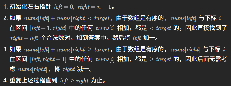 注意 (0, 3) 不计入答案因为 nums[0] + nums[3] 不是严格小于 target 。