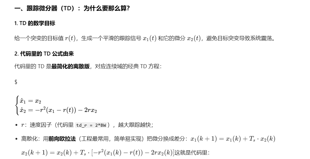 - TD 的数学核心:用"弹簧-阻尼"型微分方程生成平滑目标,离散化后实现简单,避免目标突变;