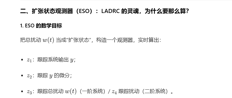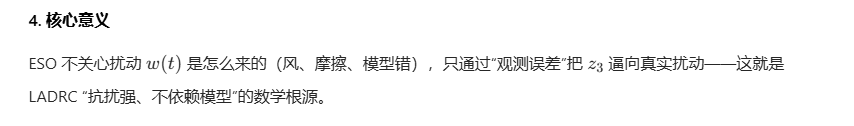 - ESO 的数学核心:把扰动扩张成状态,通过极点配置的增益和观测误差,实时跟踪状态和扰动,这是抗扰的关键;