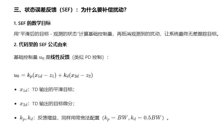 - SEF 的数学核心:线性反馈+扰动补偿,通过 u=u0−z3/b0 抵消所有扰动,让系统逼近理想无扰状态。