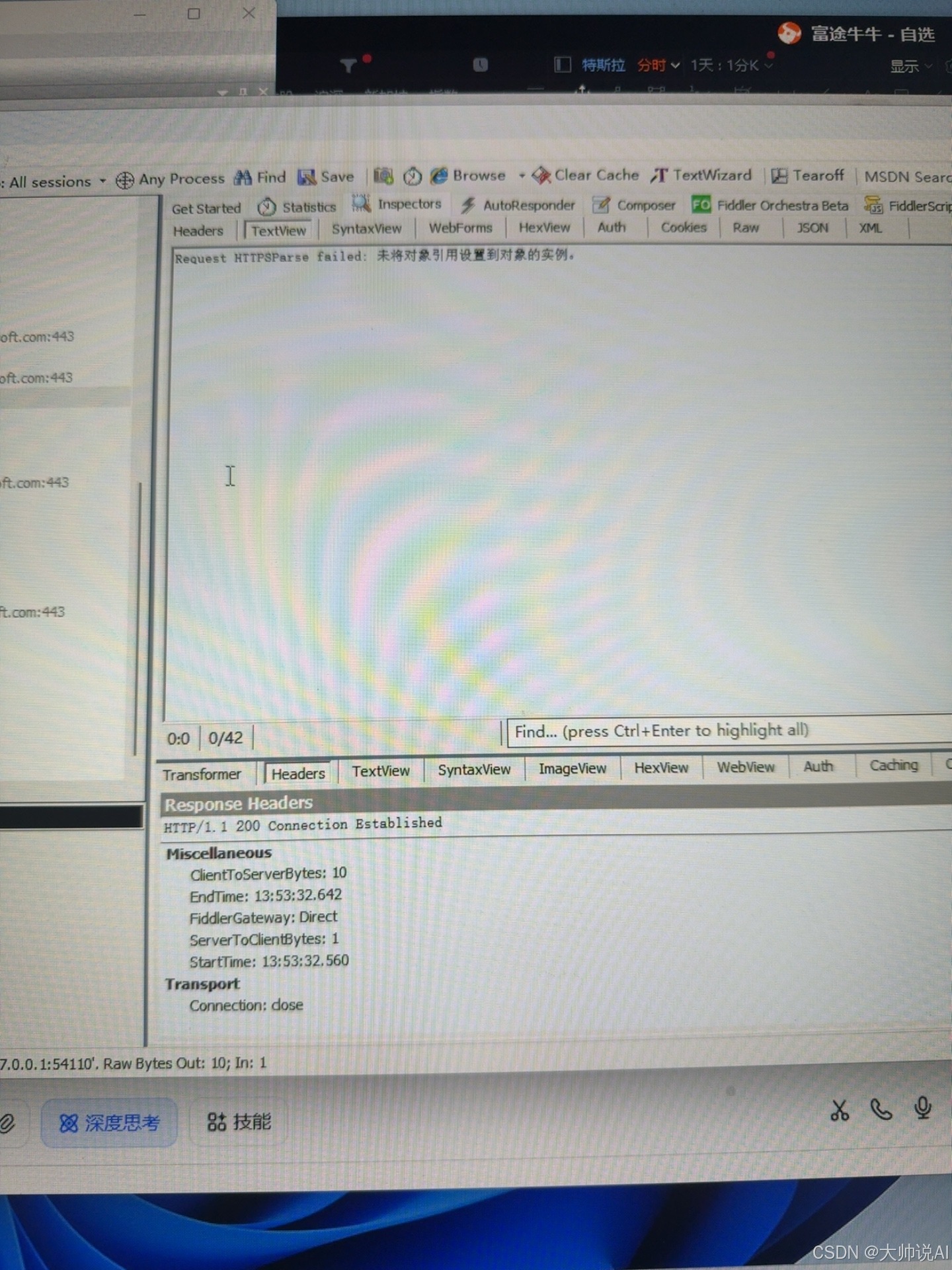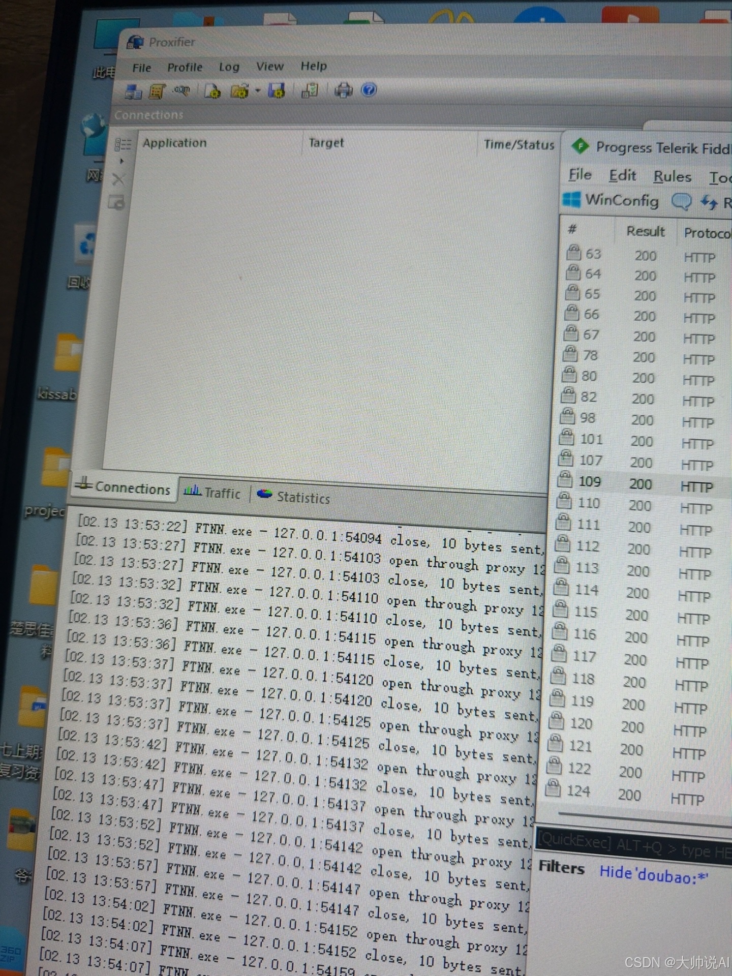 FTNN.exe尝试访问本地服务 → 被 Proxifier 转发给 Fiddler- Fiddler 收到的目标地址是