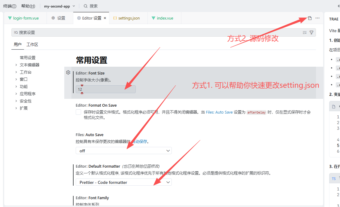 直接修改设置,底层也是修改json文件,但是直接修改json比较麻烦,不好找,还得读配置,所以一般直接修改设置就好