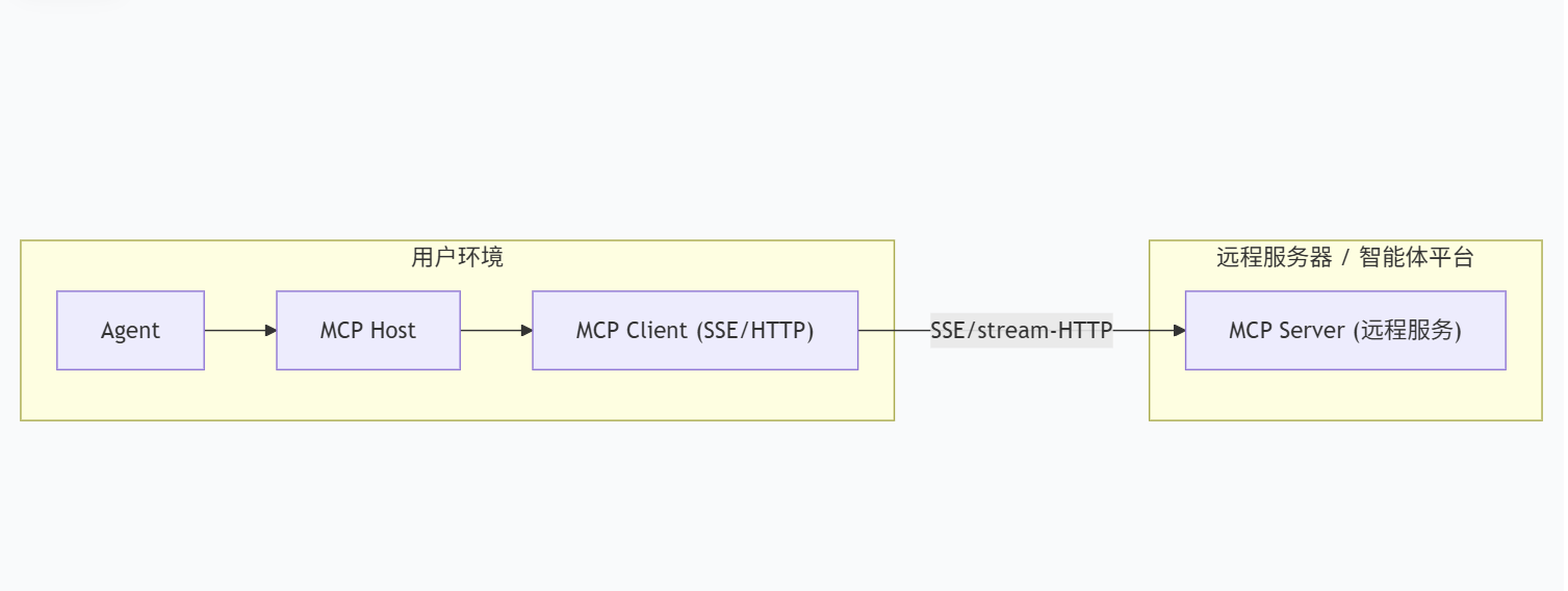MCP Server 作为独立服务部署在远程,Client 通过 SSE 或流式 HTTP 与其通信。