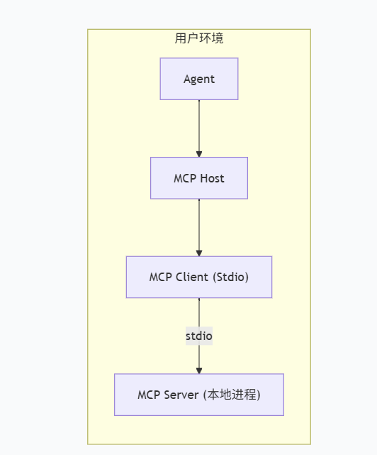 MCP Server 与 Client 位于同一主机,Client 通过标准输入输出(stdio)启动并与 Server 进程通信。