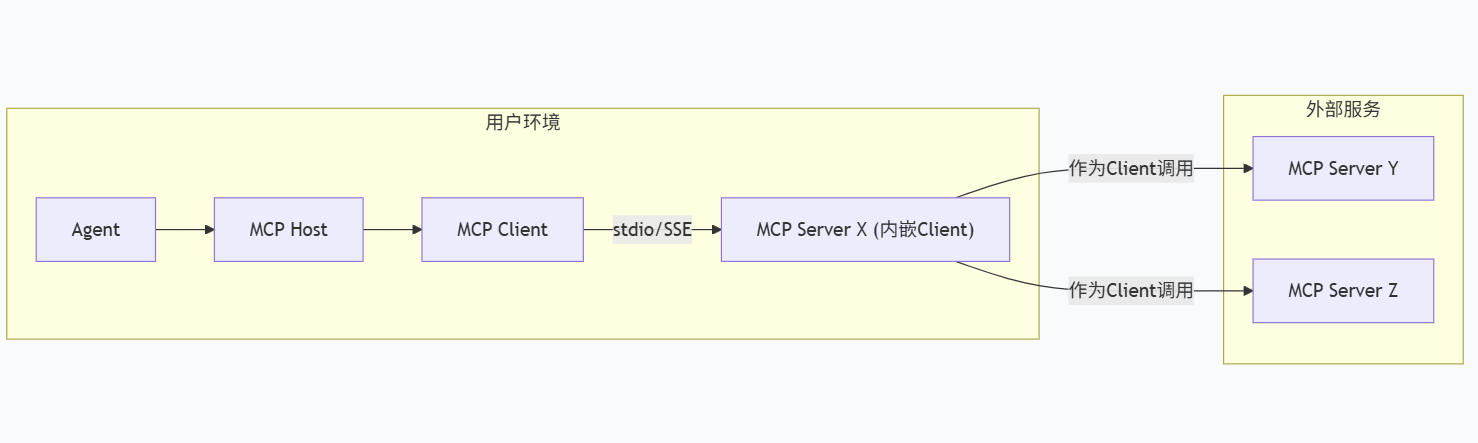 MCP Server 内部实现 Client 功能,在处理请求时可以主动调用其他 Server,组合结果后返回。