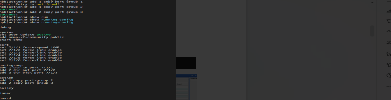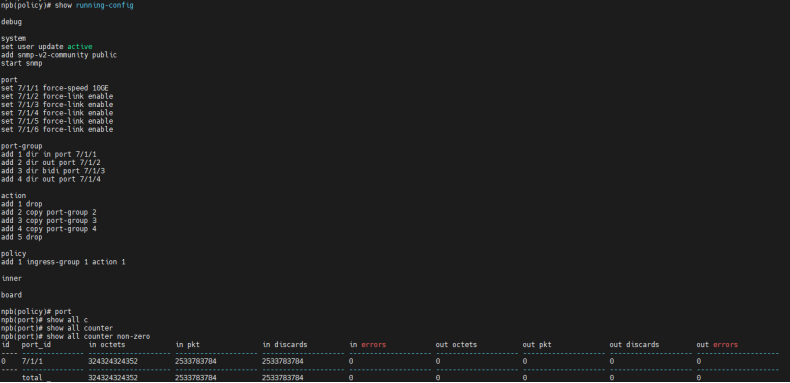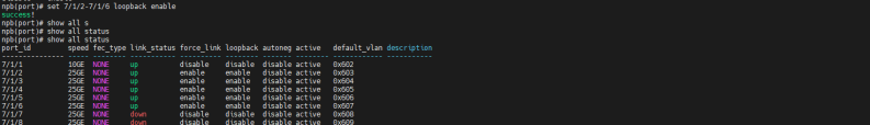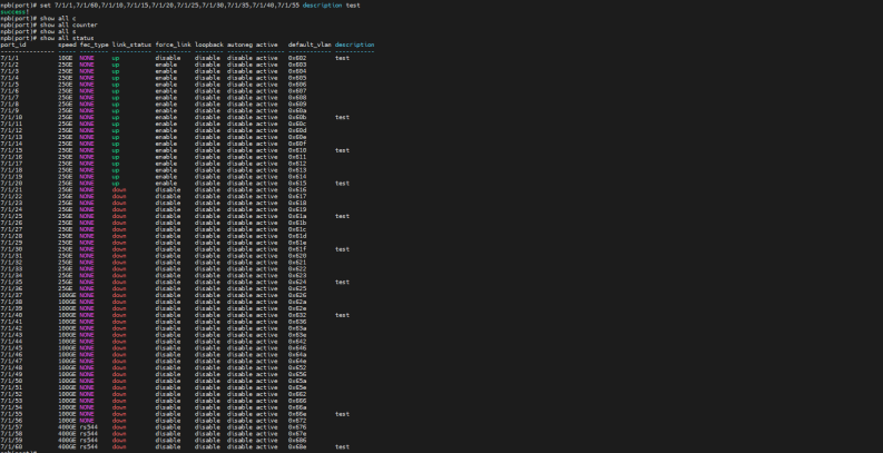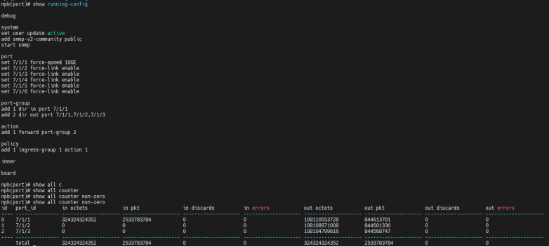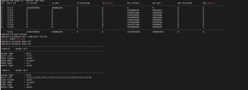 | 测试步骤: | 1. 检查随机选择被测端口进行任意类型端口组添加; 2. 检查端口组是否可删除内部端口; 3. 检查同一端口是否可被一个端口组重复添加; 4. 检查端口组是否可添加多个端口; 5. 检查端口是否可被bidi类型端口组和其他类型端口组同时添加; 6. 检查同一个端口是否可被out和in类型端口组添加; 7. 检查out和bidi端口组是否可添加同一个端口; 8. 检查端口组是否可正确根据配置接收和发送流量; 9. 检查端口组的负载crc负载均分模式是否可以进行配置成功,是否成功按照负载均分的情况进行均分; 10. 检查端口组负载均分下,删除端口组一部分端口,负载均分是否随端口组内端口进行及时更新; 11. 检查端口组负载均分配置下,添加端口是否会进行阻止和警告 12. 以上操作均打流5分钟进行测试; |||