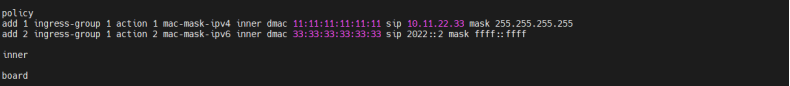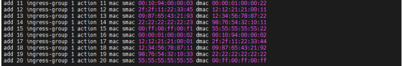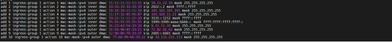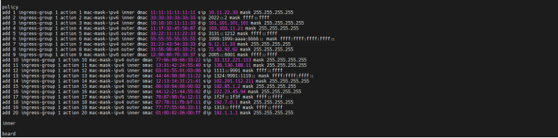 | 预期记过 | 1. 设备准确识别对应流量并进行转发,不符合规则流量自动丢弃; 2. 设备可正确识别出对应的目的mac+目的ipv4/ipv6流量,将对应流量匹配给对应端口并正确进行转发; 3. 设备可正确识别出对应的目的mac+源ipv4/ipv6流量,将对应流量匹配给对应端口并正确进行转发; 4. 设备可以正确识别源mac+源ipv4/ipv6数据流量,并将指定源mac+源ip的流量匹配给指定端口组并正确转发; 5. 设备可以正确识别源mac+目的ipv4/ipv6数据流量,并将指定源mac+目的ipv4/ipv6数据流量匹配给指定的都那口组并正确转发; 6. 应对多种mac+ip场景下设备可正确识别对应流量匹配给对应端口组并转发,不符合规则的流量将被丢弃; |||