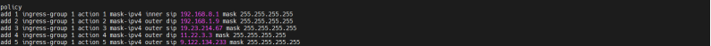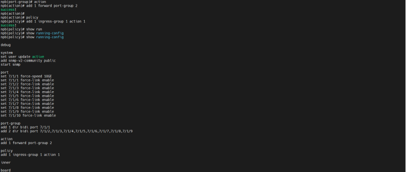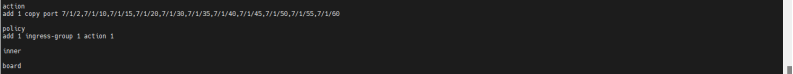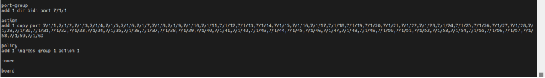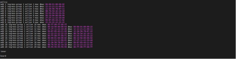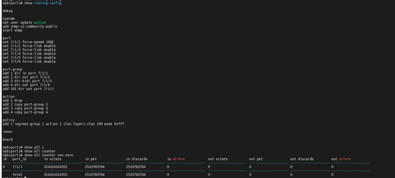 | 预期结果: | 1. 在输入输出端口组使用相同端口下,可正确接收并正确转发流量; 2. 输入输出端口组使用不同端口时,可正确将接收到的流量进行转发; 3. 负载均衡配置下,端口组内端口正确且可均分式转发流量; 4. 指定的端口组可正常转发指令流量,可转发指定的vlan指定的mac流量; 5. out和bidi类型端口组成功添加为复制端口组,in类型端口组添加失败并报错; 6. 复制端口组可正确复制对应流量并转发; 7. 输入端口组可执行丢弃动作,丢弃流量; 8. 指定流量可正确被丢弃; 以上预期结果必须同时全部满足记为通过,其余情况均为不通过。 |||