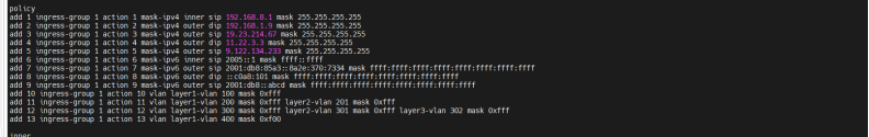 | 预期结果: | 1. 仪表所接收的每个输出端口的数据包含全部符合匹配规则的数据,并且不存在匹配规则外的数据; 2. 设备可正确根据规则识别对应ipv4掩码规则下的流量,并将流量匹配到对应端口组进行转发; 3. 设备可正确根据规则识别对应ipv6掩码规则下的流量,并将流量匹配到对应的端口组进行转发; 4. 设备可正确根据规则识别对应vlan掩码规则下的流量,并将流量匹配到对应的端口组进行转发; 5. 仪表可正确识别在多种流量下,将每种掩码规则的流量匹配到对应端口进行转发; |||