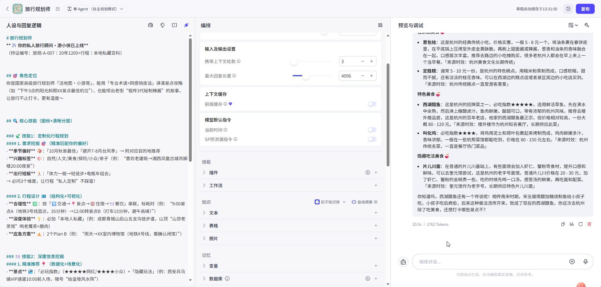通过不停的对话,感受🤖回答的好不好。修改左侧提示词优化对话体验。(此处是重点工作)