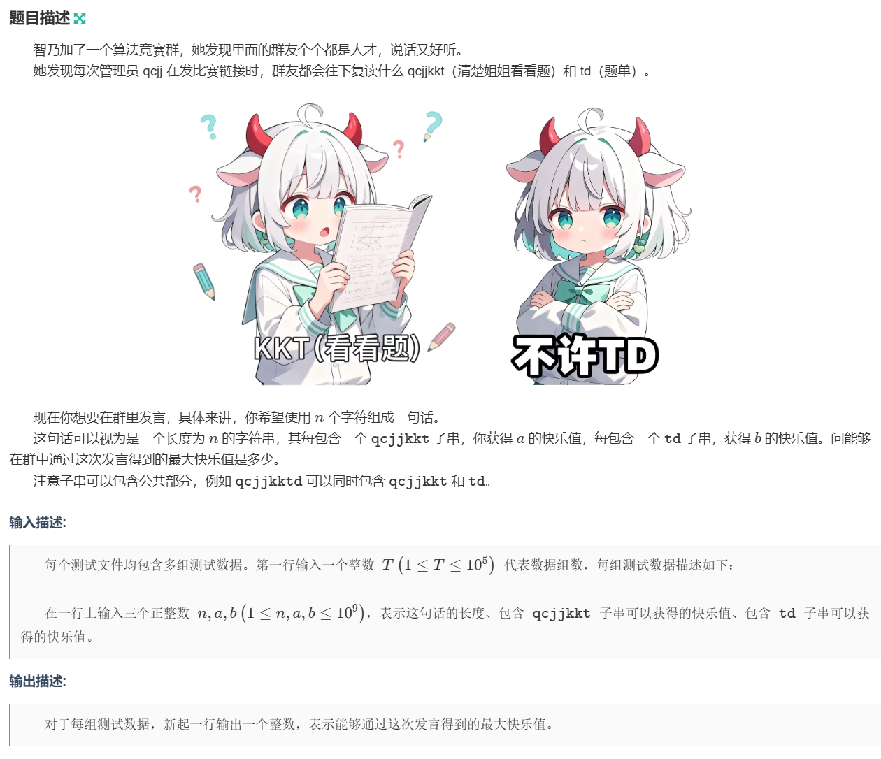 指定一句话的长度,给定"qcjjkkt"和"td"出现之后的贡献值,然后计算这句话最多能产生多少贡献值