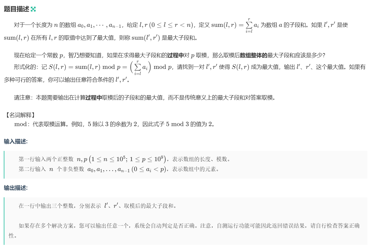 给定一个数组,每个前缀和都对p取模,然后要求计算针对p取模的最大子段和