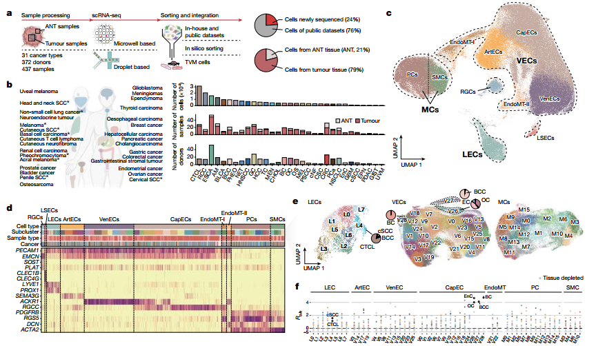 图1 :研究整合生成了跨31种癌症类型的肿瘤血管单细胞图谱,并将其划分为内皮细胞、壁细胞等29个血管内皮、8个淋巴内皮及16个壁细胞亚群。