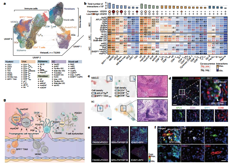 图5 :血管细胞与肿瘤微环境细胞通过复杂的配受体相互作用,共同构建了一个支持血管生成且具有免疫抑制特性的微环境。