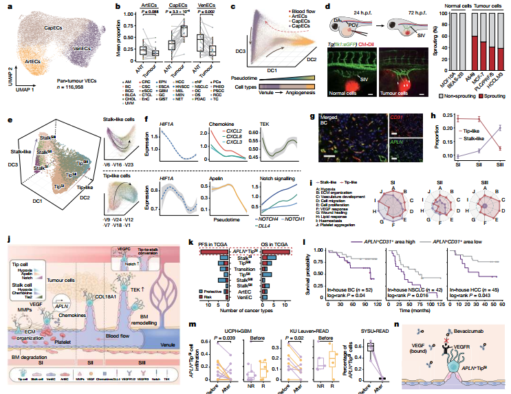 肿瘤进展和转移高度依赖血管提供的氧气和营养物质。研究团队生成了涵盖372名捐赠者的全面肿瘤血管系统单细胞图谱,包含内皮细胞和壁细胞共计183,977个。研究发现,肿瘤血管生成是由静脉内皮细胞启动并向动脉内皮细胞方向延伸的。研究鉴定了与预后不良及抗VEGF疗法响应相关的