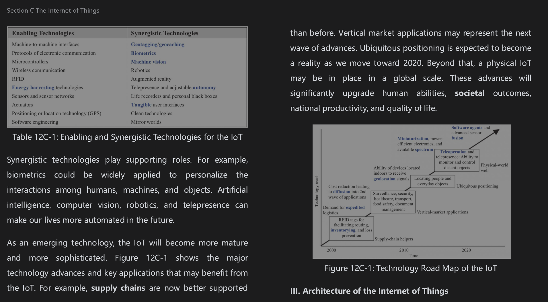 ①当一个科技出现的时候,物联将会变得更加成熟和复杂。②图片12C-1展示了主要科学技术的进步和关键应用,这些好处可能都来自于物联。③举个例子,供应链现如今逼过去获得了更好的支持。④垂直商场的应用可能代表了下一个进步的趋势。⑤普适计算被期望成为现实在我们向着2020年前进的路上。⑥除此之外,物理上的物联处在一个全球的规模的发展中。⑦这些发展将会对人类能力、社会产出、国家生产力还有生活质量的提升有着重大意义。