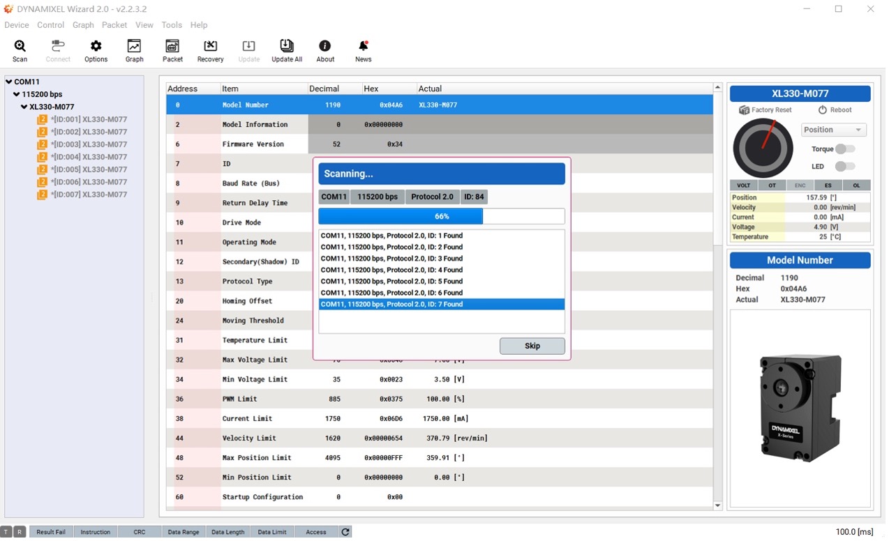 连接完成后,打开 DYNAMIXEL Protocol 2.0 工具,在菜单栏点击 Scan 扫描总线上的舵机。