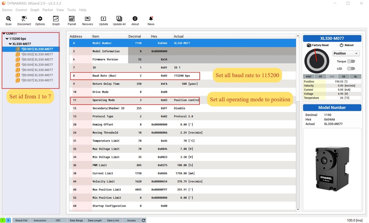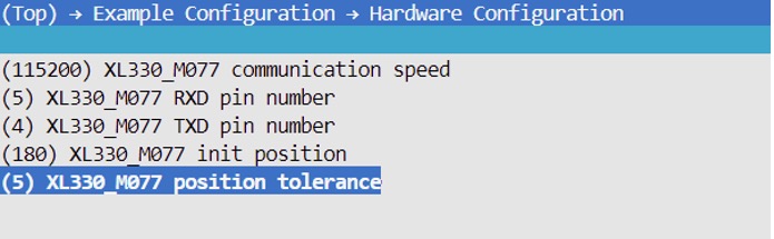 - XL330_M077 配置说明:如需修改 UART 设置或通信引脚,请调整 XL330_M077 communication speed、XL330_M077 RXD pin number 以及 XL330_M077 init position;