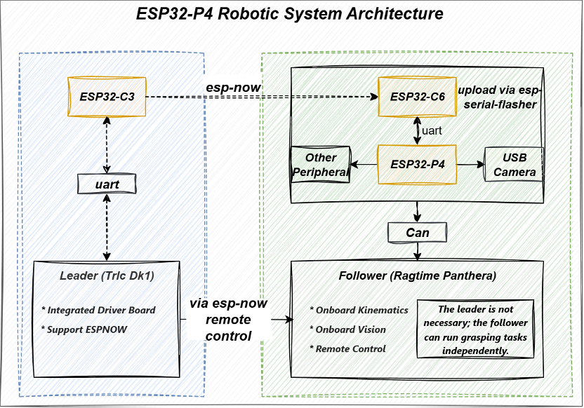 - 远程控制能力:通过一套同构的小型机械臂采集关节数据,并基于 ESP-NOW(ESP32-P4-Function-EV-Board 上的 ESP32-C6)无线发送,实现远程操控