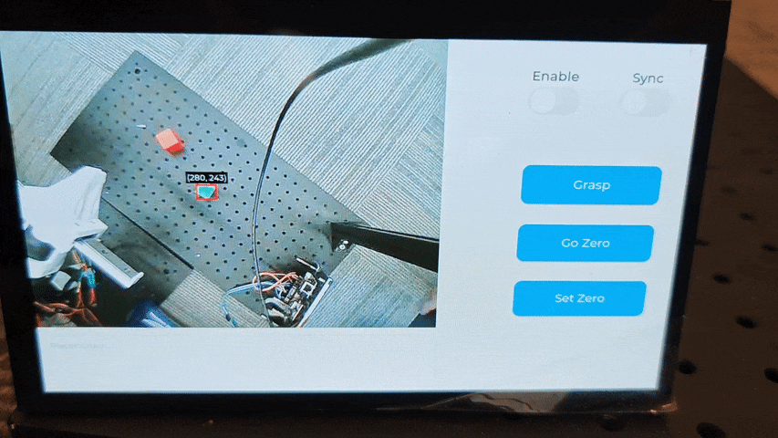 完成标定、参数正确保存至 NVS,并将 USB 摄像头插入 ESP32-P4-Function-EV-Board 的高速 USB 接口后,LCD 屏幕将显示摄像头画面。放置绿色方块,确认其在屏幕上被正确识别后,点击 Grasp 按钮尝试抓取。