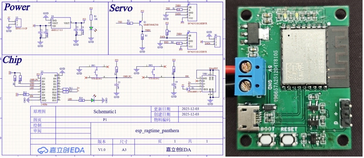 ESP32-C3 驱动板将 ESP32-C3 与总线舵机电路集成在同一模块中,支持外部 5 V / ≥1 A 电源同时为舵机与ESP32-C3 供电。通过板载 Micro-USB 接口可直接烧录和调试固件。点击此处下载用于 PCB 打样的 Gerber 文件。