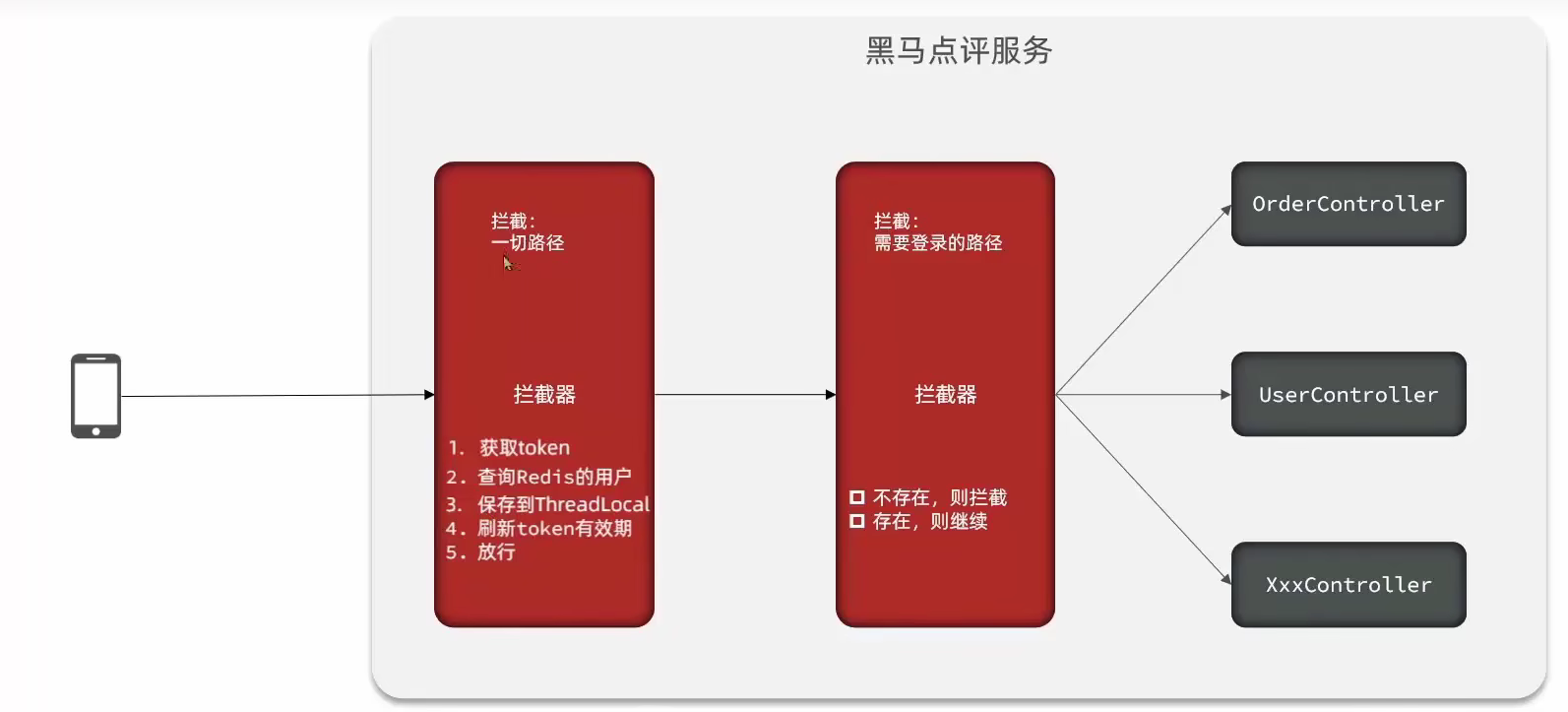 如果我们采用phone:手机号这个的数据来存储当然是可以的,但是如果把这样的敏感数据存储到redis中并且从页面中带过来毕竟不太合适,所以我们在后台生成一个随机串token,然后返回给前端,然后让前端带来这个token,然后我们从请求头中拿出来就行,就能完成我们的整体逻辑了。但是第一步的时候不能这样设计,因为第二部需要通过手机号去获取对应的验证码,所以设计要包括手机号。