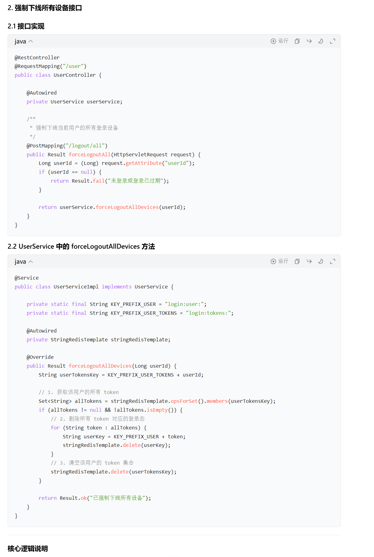 实现强制所有设备下线功能:只需要知道useid然后去找B+userid这个里面所有的token,这就表示登录的设备,然后我们先把这个token登录态删了,再B+userid集合清空