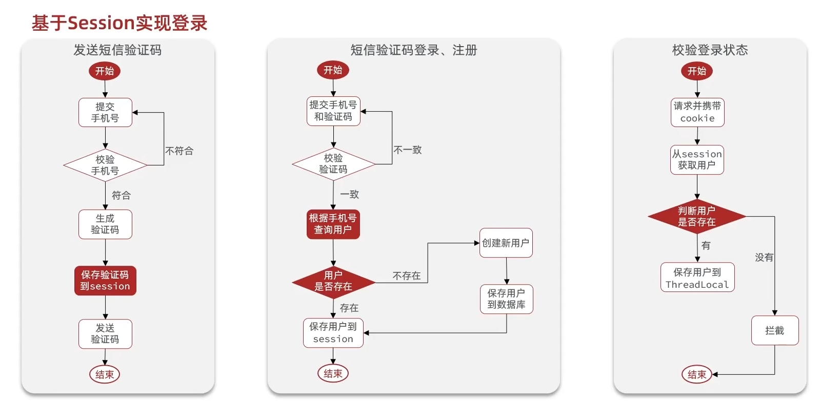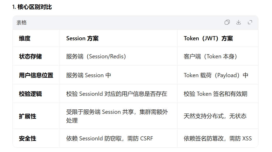 区别就是在于保存用户信息到session,然后校验的时候直接看用户信息是否存在,而token下发jwt令牌是自己生成jwt令牌给用户,然后校验令牌即可。其实其他步骤token也可以实现,就比如我先发送短信验证码,然后可以短暂的保存验证码到redis或者session里面(其实我觉得用jwt令牌就保存在redis里面就行),然后和用户发过来的比对,成立则说明登录成功,我们可以保存在数据库里(或者使用异步线程保存到数据库,来处理高并发情况,这是后边讲的),并且给他下发jwt令牌即可,每次拦截jwt令牌,校验有效性即可。