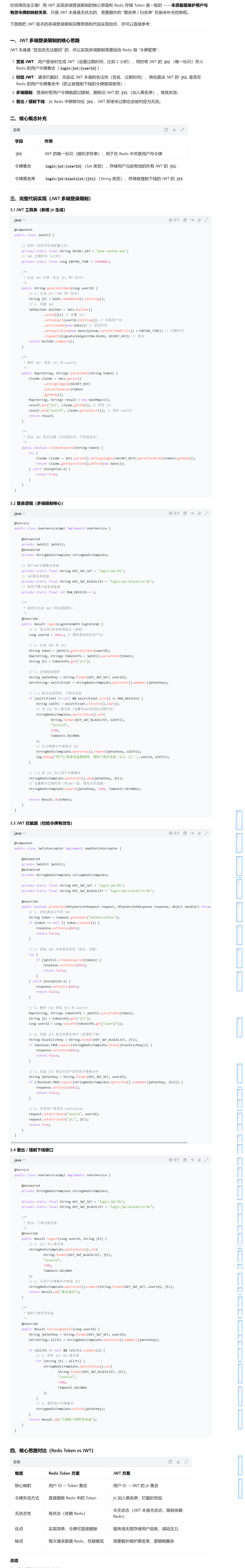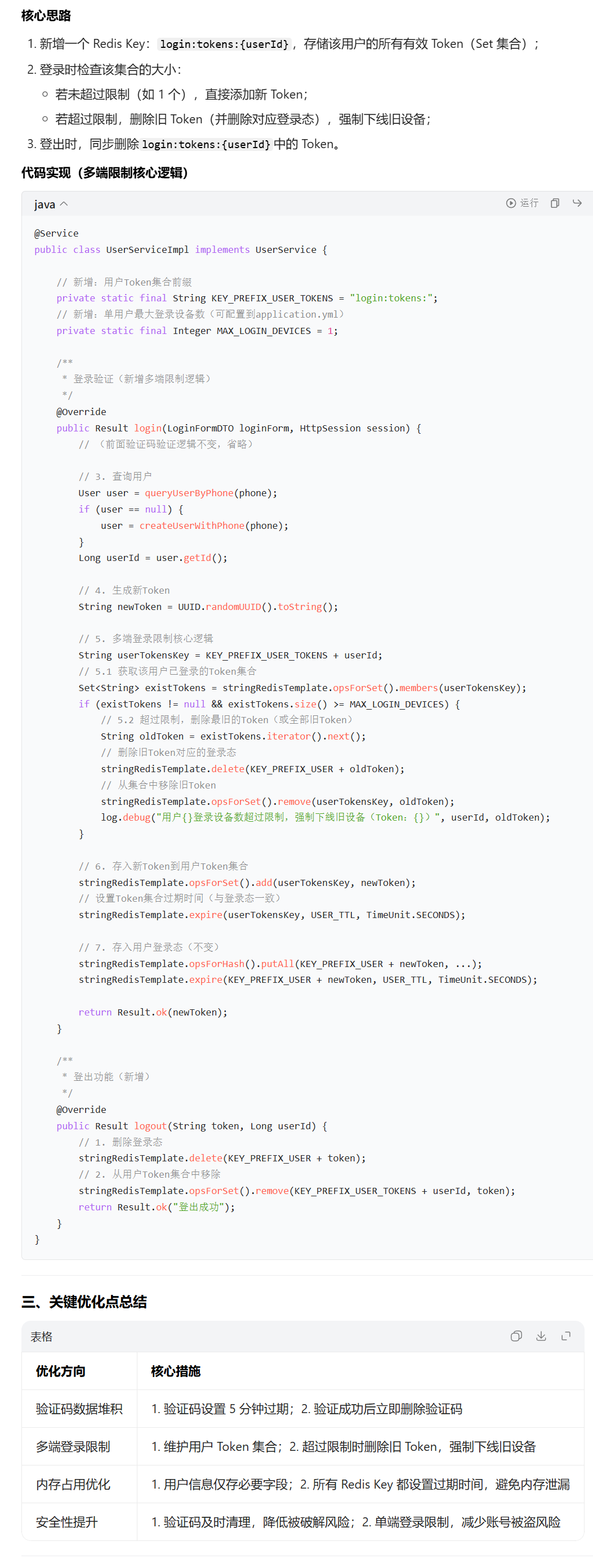 第三相当于一个改进吧,我发现如果我一直用一个手机号发验证码登录,就会保存很多个用户对象到redis中,并且他们存储的信息都一样(验证码不会,因为验证成功我们删除了),这是因为在验证成功后保存用户信息到redis里,没有限制会一直保存,这是一个问题,我感觉这就是能够多端登录的原因,以后可以加以限制,判断redis里的数量。所以我要实现多端登录并且登出处理,我说一下把一共有两个要存储的信息,一个就是当前登录态比如说我用token(uuid表示的),还有一个存储user这个用户的登录token的比如叫B+userid(使用set集合存储),所以现在我在查询完数据库后,我要查询这个B+userid所有的集合里的元素,完事我看有没有超过最大限制,没超过我就把这个token加进B+userid表示我这个设备可以登录,你用吧,如果超过最大限制呢(其实只可能等于,比如我限制两个设备,我登录第一个可以,第二个可以,第三个就不行了),所以我们的判断条件一定是有=的,如果等于最大限制也得减少一个最旧的,即同时删除这个最旧的token(一个用户设备删除)和删除这个key(登录态删除)。这样就行了。然后登出的话,我也是要删除两部分吧,一个是当前登录态,一个是这个用户设备也删了,而且为了安全考虑,一个用户只能删自己的信息,所以登出功能要知道当前的token(登录态)和userid(因为要删设备),所以这时拦截器就得同时把这两个必要的信息都存储起来。值得注意的是在第一层拦截器里必需对当前登录态进行更新时间,而是否对设备更新时间,取决于实际需求,我感觉一般不更新,因为如果更新那我不是一直访问资源在没有其他登录的时候我就会一直在线吗,感觉没必要