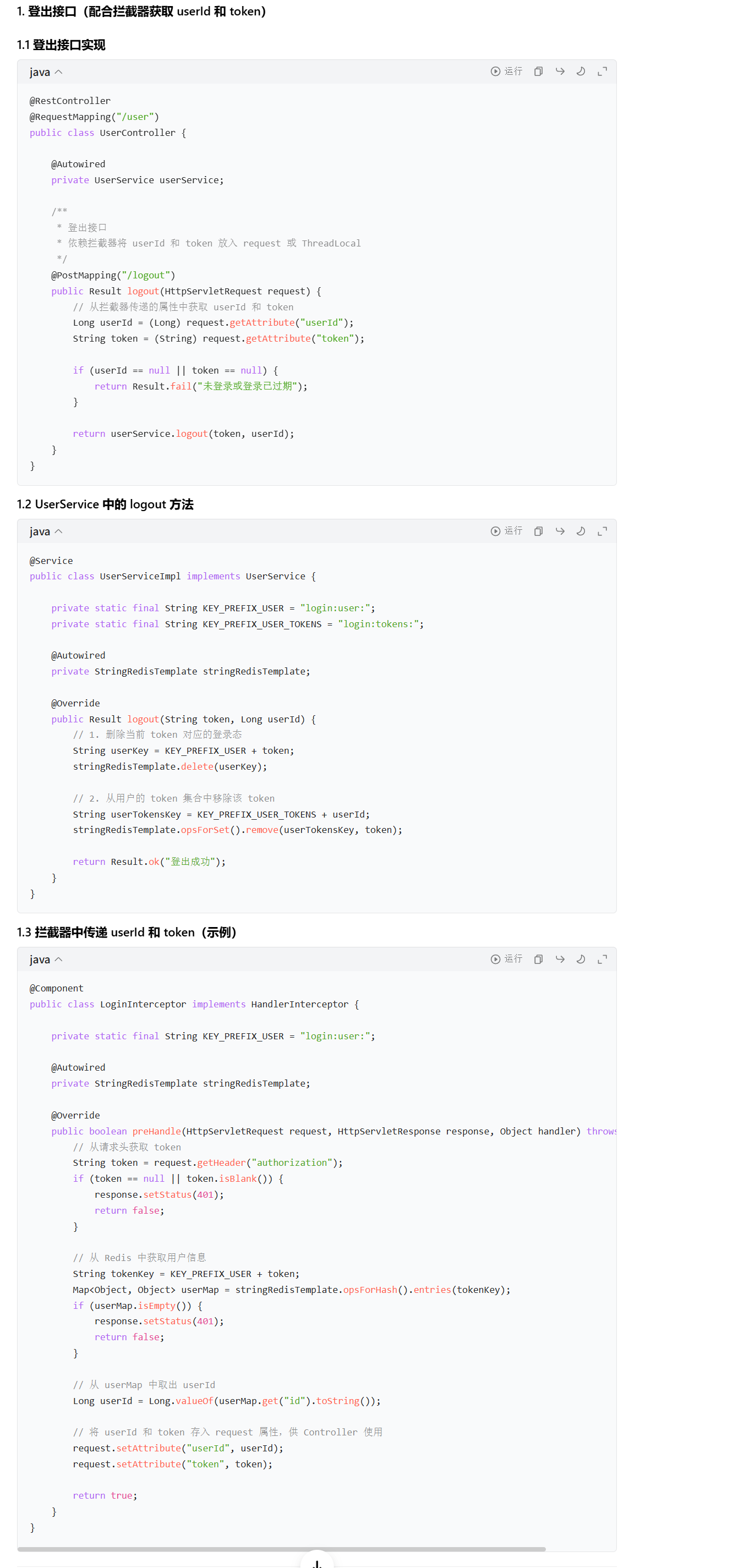 最后登出功能应该加上权限限制,就是使用这个功能的时候只能登出自己的账号,这时候传参,传入userid和当前的这个token即可,这就要求拦截器需要把这次的token也带上,不能只存用户dto,因为你登出你要删除这个token对因的登录态和存储用户token的集合中的这个token。