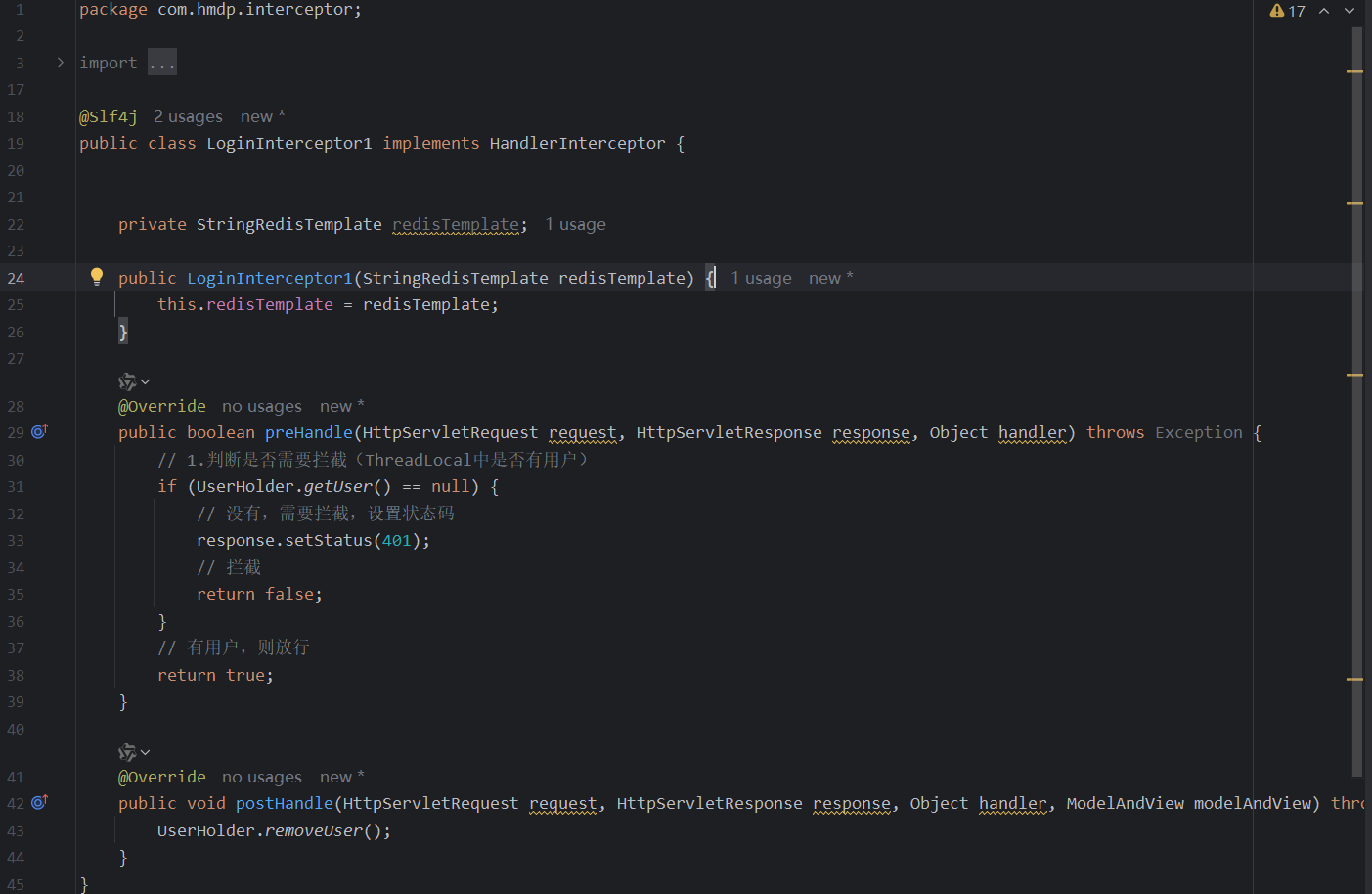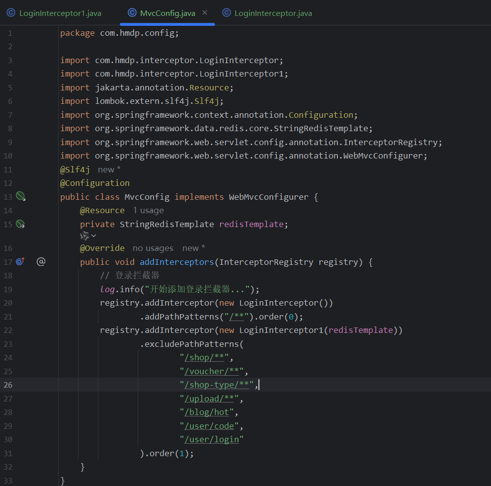 而@Configuration封装了,表示可以注入,所以我们先注入一个,然后在registry.addInterceptor(new LoginInterceptor1(redisTemplate)) .addPathPatterns("/**").order(0);使用它即可。。